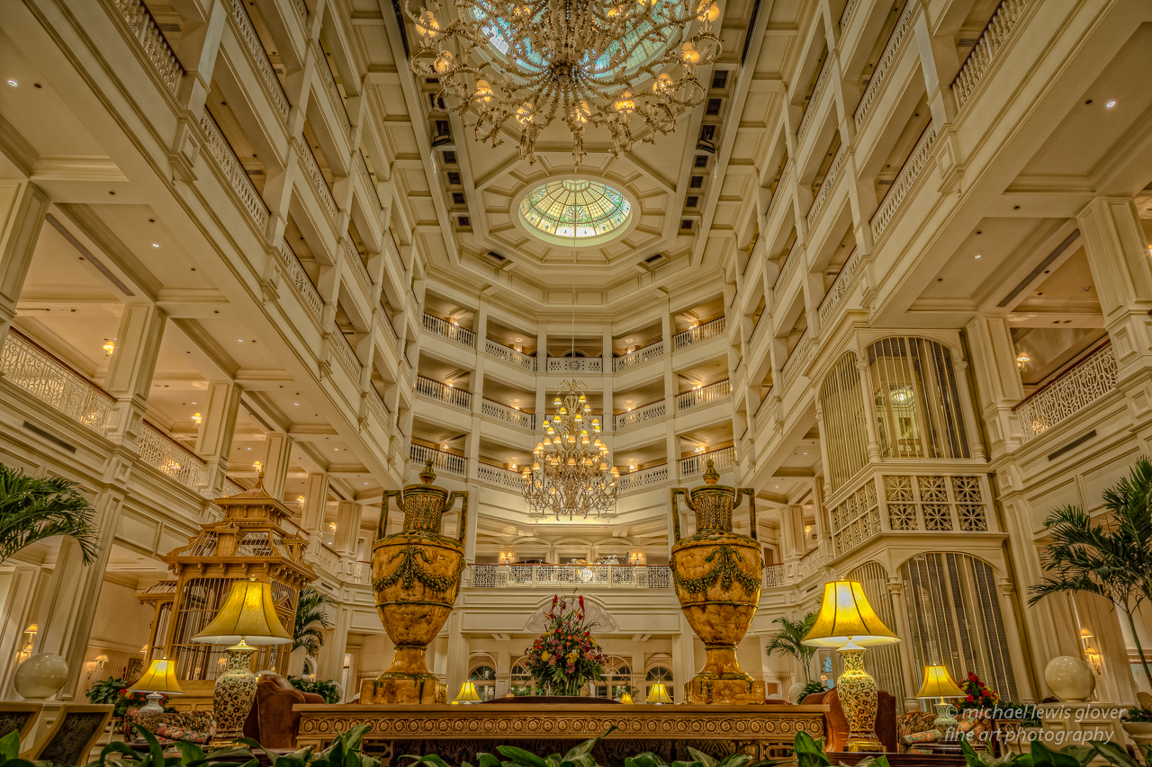 Welcome to Disney’s Grand Floridian Resort and Spa! The architectural design of this place is a true marvel. On a recent visit to this spectacular hotel, I decided to wait around til later in the evening, hoping to capture some images without people. At 11:00 on a Sunday night, just about everyone had retired to their rooms after a full day of fun. I only had to wait a couple of minutes to get my shots. I love all of the details they put into the layout like the massive birdcage on the left or the giant urns on the table in front of me. And the lighting is unrivaled with those magnificent chandeliers! On the second floor in the back they have a band that plays a very nice variety of music throughout the day.