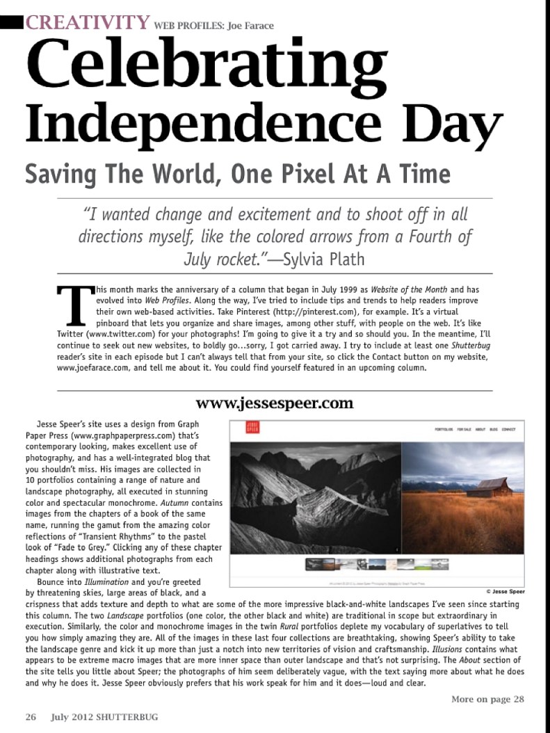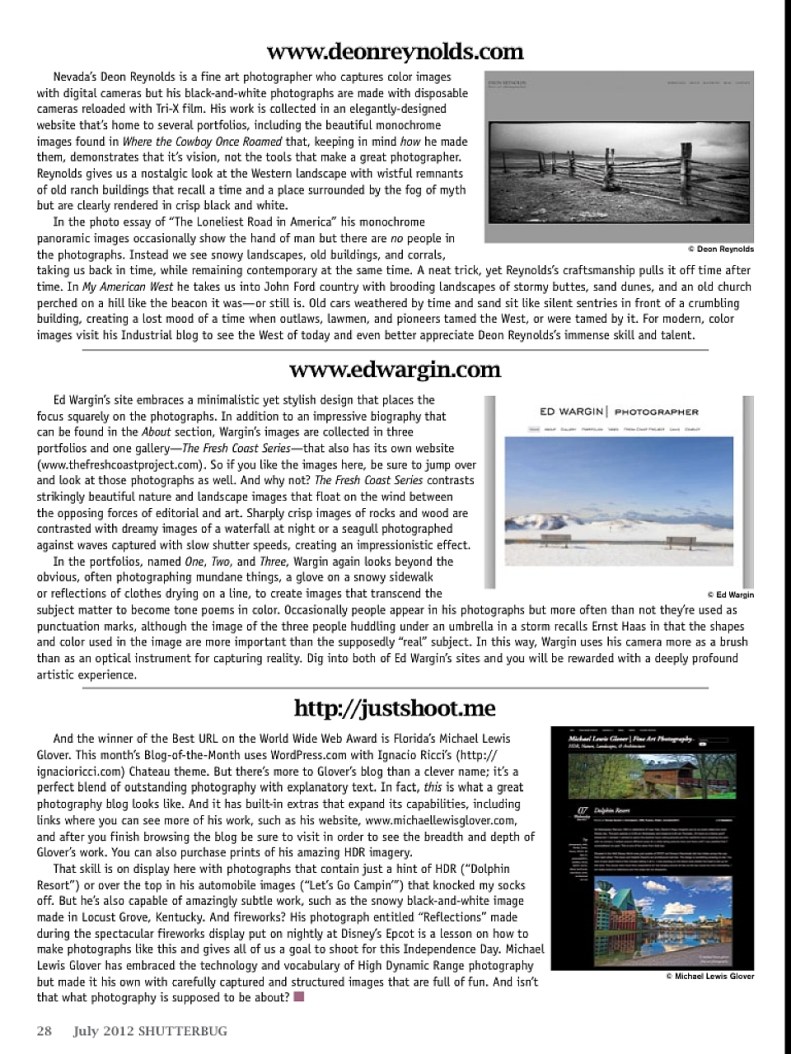 On that note I wanted to share something that recently happened to me. Back in March I was contacted by Joe Farace who writes a column in Shutterbug Magazine (www.shutterbug.com) titled Web Profiles. He wanted to feature my blog in the July 2012 issue, and needed my permission to include a screen shot of my blog page. I of course had no problem with that so I said yes. Well the magazine just came out and I am so excited to see it. I have included screen shots of the cover and the pages of the article.