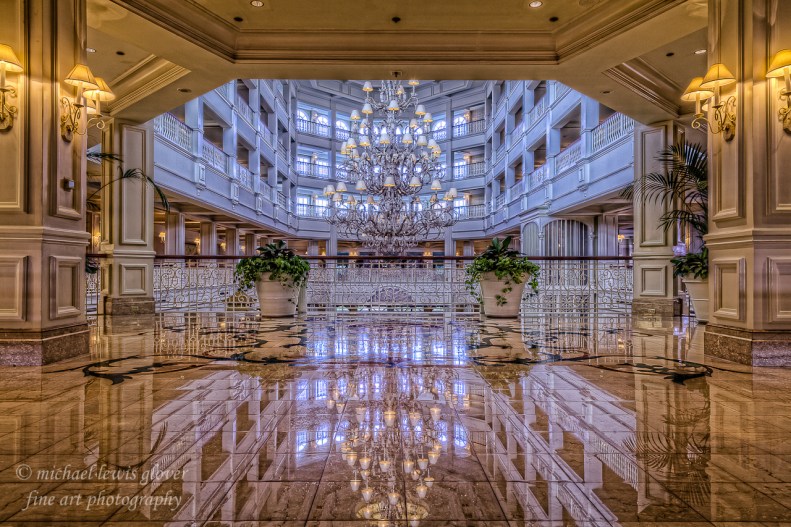 Welcome to Disney’s Grand Floridian Resort and Spa! The architectural design of this place is a true marvel. On a recent visit to this spectacular hotel, I decided to wait around til later in the evening, hoping to capture some images without people. At 11:00 on a Sunday night, just about everyone had retired to their rooms after a full day of fun. I only had to wait a couple of minutes to get my shots. I love all of the details they put into the layout like the massive birdcage on the left or the giant urns on the table in front of me. And the lighting is unrivaled with those magnificent chandeliers! On the second floor in the back they have a band that plays a very nice variety of music throughout the day.